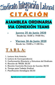La Directiva del Sindicato Industrial de Integración Laboral SIIL de Codelco División Andina remite citación a asamblea virtual vía Teams, para el próximo jueves 25 y viernes 26 de junio.